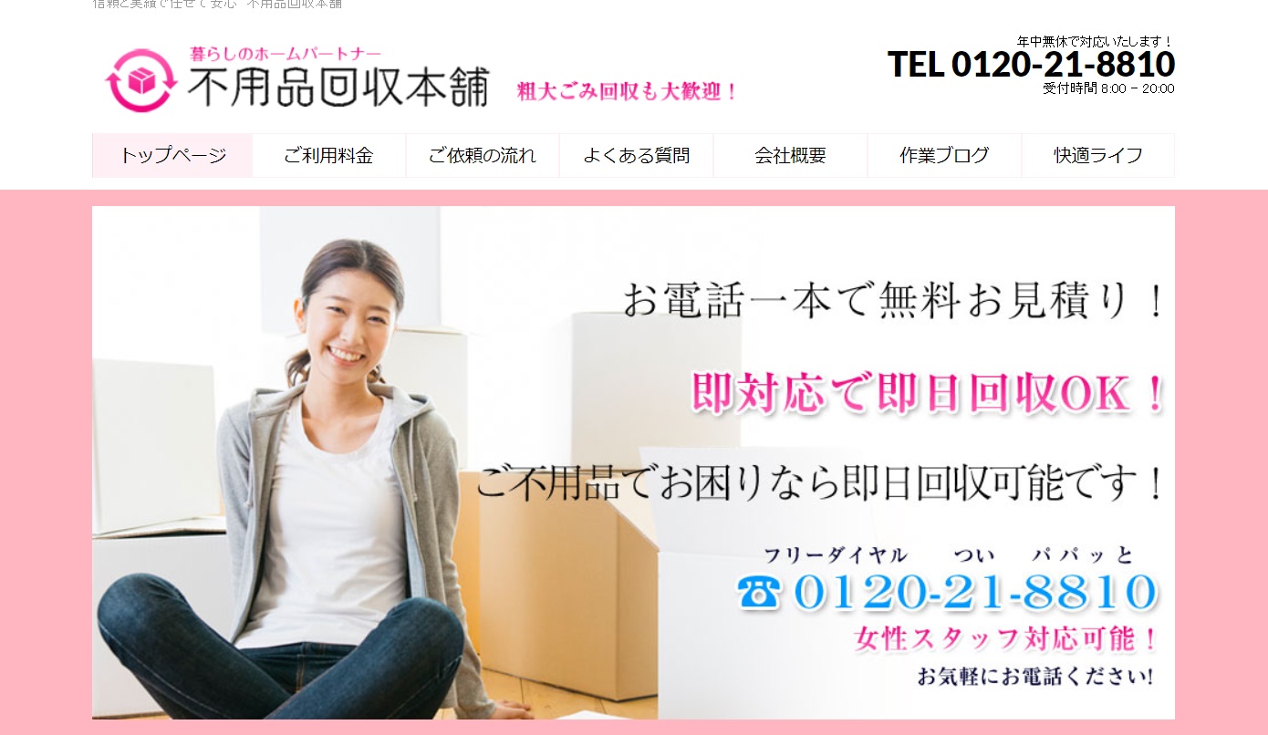 “不用品を処分したいと思った時に、いつも同じ会社にお願いすることにしています。その会社というのは、電話も気持ちよく話してくれるし、なんといっても笑顔で爽やか位対応してくれるところなのです。同じお願いをするなら、気持ちよく対応してくれるところがいいと思っています。”
